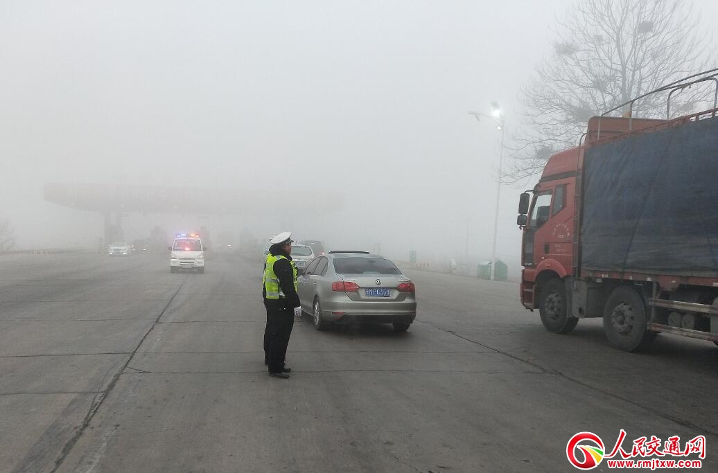 圖為當(dāng)日8時(shí)許,臨猗交警大隊(duì)北景中隊(duì)民警駐守209國(guó)道北景收費(fèi)站附近,指揮、疏導(dǎo)車輛有序通行,提醒駕駛員們要開(kāi)啟雙閃,減速慢行,謹(jǐn)慎駕駛。