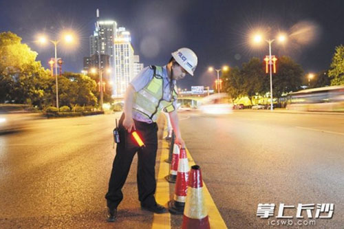劉陽是昨日的晚班值班民警,本來應該是15時到崗,工作到22時結(jié)束。“今天不行,根據(jù)領導安排,9時到12時需要加班支援,加班命令必須無條件服從。”橘子洲大橋北湘江路有20米路段需擺放錐形筒進行臨時管制,禁止車輛轉(zhuǎn)彎或掉頭,劉陽晚班期間每半小時就要來巡查一次,確認這些錐形筒在原位。