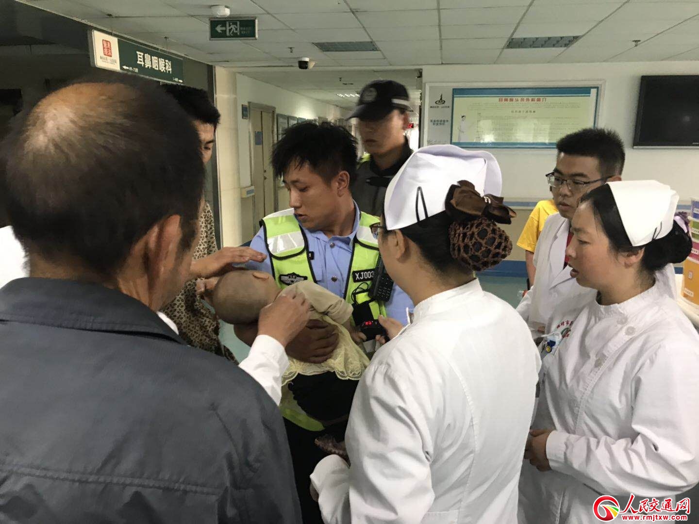 此時(shí),孩子一直哽咽、打嗝、閉著眼睛、表情痛苦。見狀,常坤立即向經(jīng)開區(qū)公安分局交警大隊(duì)指揮中心匯報(bào)情況,并攔了一輛出租車就往醫(yī)院趕。騎警黃浩、張俊杰一路拉響摩托警報(bào)在前面開道,送患者的出租車緊跟其后。