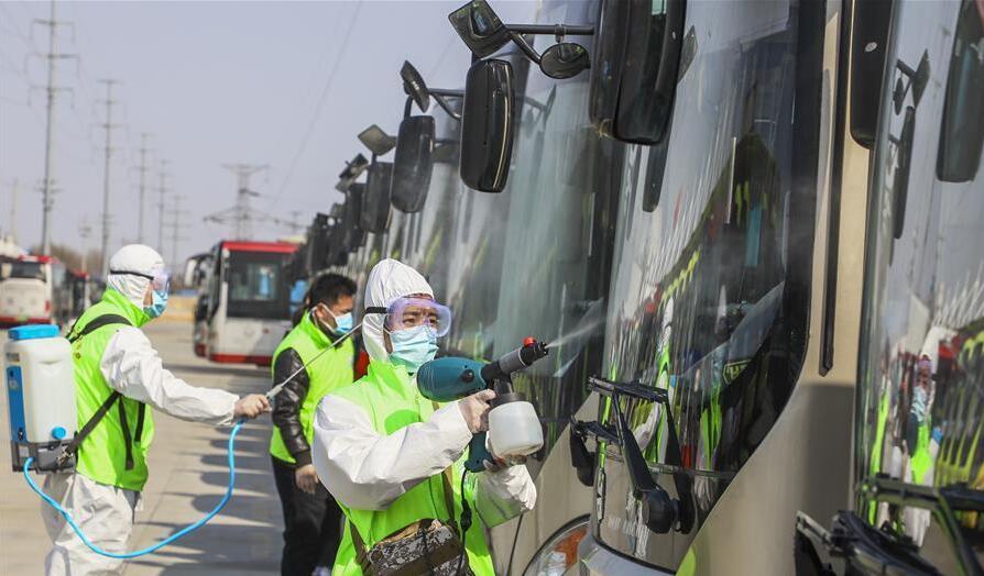 3月4日,滕州市環(huán)保志愿者正在為客運(yùn)車(chē)輛消毒。 山東省滕州市環(huán)保志愿者對(duì)滕州市交運(yùn)公司所屬營(yíng)運(yùn)的1000余輛公交車(chē)、校車(chē)、出租車(chē)等客運(yùn)車(chē)輛進(jìn)行全面義務(wù)清洗消毒,為道路客運(yùn)恢復(fù)運(yùn)營(yíng)創(chuàng)造清潔安全的乘車(chē)環(huán)境。