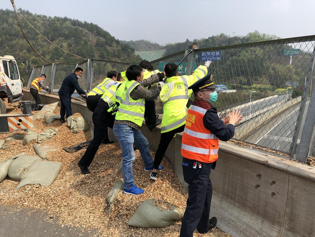 11時(shí)18分,鄂西北公司應(yīng)急養(yǎng)護(hù)巡檢組趕到事故現(xiàn)場(chǎng)。經(jīng)現(xiàn)場(chǎng)勘查后發(fā)現(xiàn),事故車輛滿載30噸木屑側(cè)翻后鋪滿車道,并散落至互通橋下漢十高速主線路面,正常行車存在隱患,且匝道橋防護(hù)網(wǎng)因事故碰撞即將脫落,存在二次事故隱患。為防止次生事故發(fā)生,巡檢組采取先消除隱患后再拖離車輛。一方面立即設(shè)置安全警示區(qū)域、擺放錐桶、拉響警報(bào)、設(shè)置安全員后方搖旗,警示過往車輛減速慢行;另一方面考慮事故正處鄖十高速互通匝道橋上,積極配合相鄰管段高警、路政部門,壓實(shí)聯(lián)勤聯(lián)動(dòng)機(jī)制,現(xiàn)場(chǎng)調(diào)來大型吊車,將側(cè)翻的重型半掛牽引車移位放正,并及時(shí)清除路面障礙物。