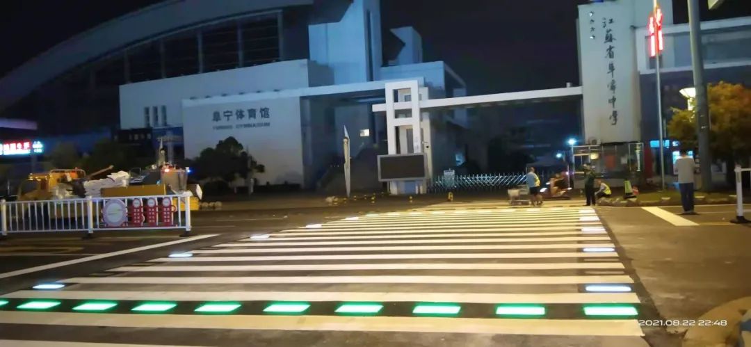 江蘇省阜寧中學(xué)東門口地處上海路上,交通流量很大。鹽城市阜寧縣領(lǐng)導(dǎo)及交通主管部門,想學(xué)校所想,為民辦實(shí)事?紤]到開學(xué)后下晚自習(xí)學(xué)生的交通安全,在此處鋪設(shè)了藍(lán)泰智能發(fā)光斑馬線,剛剛施工完畢。開學(xué)后,同學(xué)們可以踩著“星光”過馬路啦。