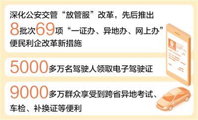 駕駛證電子化推廣應(yīng)用。從今年9月1日起,駕駛證電子化已分兩批推廣應(yīng)用,覆蓋北京、上海、廣州、西安等200個(gè)城市,受到群眾廣泛關(guān)注和普遍歡迎。目前,已有5000多萬(wàn)名駕駛?cè)祟I(lǐng)取電子駕駛證,實(shí)現(xiàn)手機(jī)在線“亮證”“亮碼”。