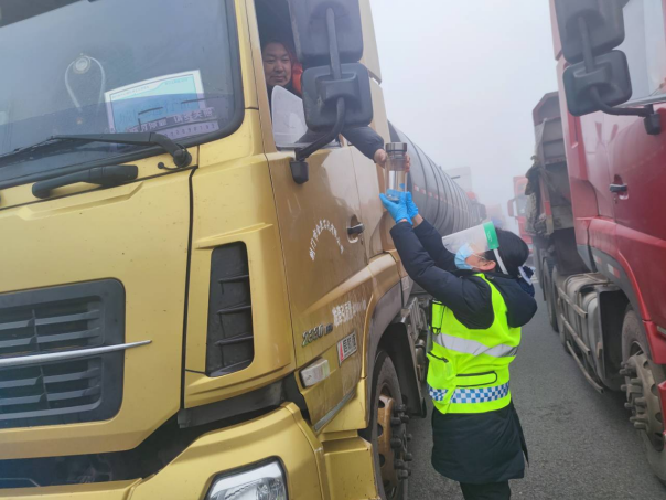 1月12日,因受大霧惡劣天氣影響,湖北交投普濟(jì)收費(fèi)站對(duì)入口進(jìn)行交通管制達(dá)14個(gè)小時(shí),看著面前焦急等待的司機(jī),普濟(jì)管理所組織人員為滯留車輛送去開(kāi)水、食品,讓他們?cè)诤涞亩斓母惺艽喝张?yáng)。