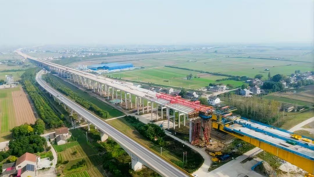 面對(duì)2408片箱梁的預(yù)制與架設(shè)重任,項(xiàng)目管理團(tuán)隊(duì)以創(chuàng)新思維破解效率難題。通過(guò)構(gòu)建“智慧梁場(chǎng)+傳統(tǒng)梁場(chǎng)”雙模協(xié)同生產(chǎn)體系,實(shí)現(xiàn)了資源靈活調(diào)配與工序精準(zhǔn)銜接。“兩端并進(jìn)、流水作業(yè)”的施工組織模式,讓預(yù)制、養(yǎng)護(hù)、轉(zhuǎn)運(yùn)、架設(shè)各環(huán)節(jié)環(huán)環(huán)相扣。特別是在胡家場(chǎng)特大橋跨越351國(guó)道的施工關(guān)鍵期,項(xiàng)目團(tuán)隊(duì)通過(guò)精細(xì)化的交通組織方案,以限寬、限載等精準(zhǔn)管控措施,成功破解了“邊施工、邊保通”的難題,展現(xiàn)了高超的工程統(tǒng)籌能力。