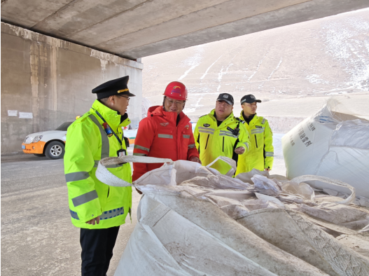 圖為聯(lián)合排查組在昌嶺山路段查看環(huán)保融雪劑儲備情況