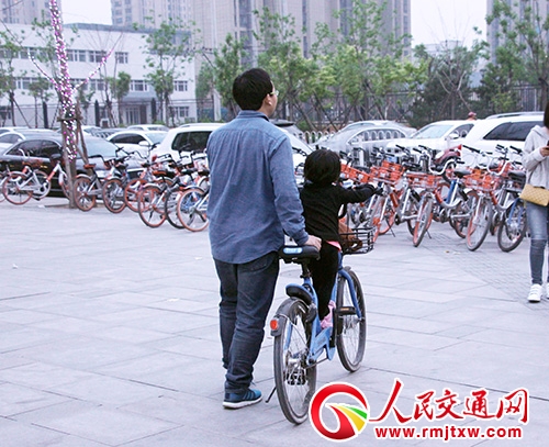正準(zhǔn)備載著孩子騎共享單車(chē)離開(kāi)的家長(zhǎng)