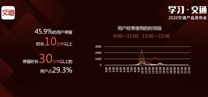 衡量一款APP的用戶粘性,“用戶停留時間”是主要的指標之一。目前,交道APP每天平均停留時長超過10分鐘的用戶占比高達45.9%,其中近三分之一的用戶停留時長在30分鐘以上。