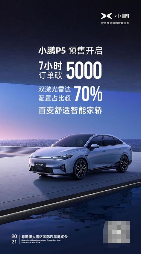 小鵬P5受鵬友認(rèn)可,百變舒適智能家轎P5,預(yù)售7小時訂單破5000。感謝每一位鵬友的厚愛,我們將不負(fù)期待,與你一起開啟智能出行的新時代。