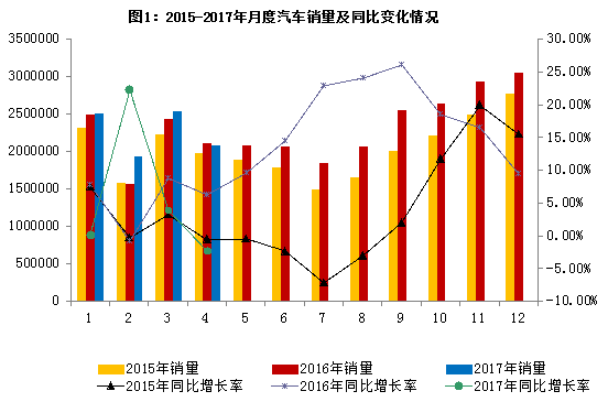 2017年4月,汽車市場需求乏力,汽車產(chǎn)銷環(huán)比與同比均有所下降。1-4月,汽車產(chǎn)銷增幅比一季度略有減緩。