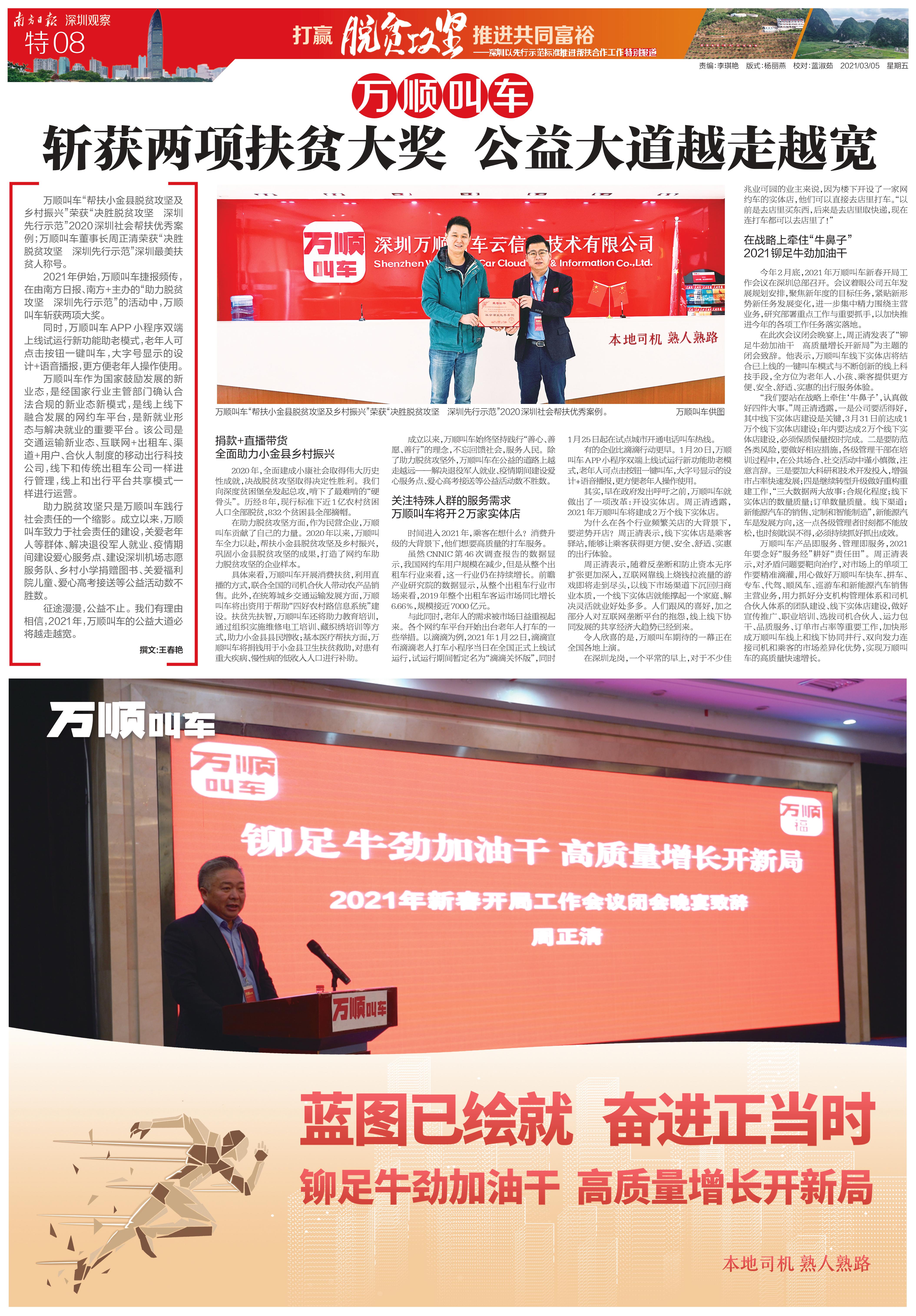 2021年伊始,萬(wàn)順叫車捷報(bào)頻傳,在由南方日?qǐng)?bào)、南方+主辦的“助力脫貧攻堅(jiān) 深圳先行示范”的活動(dòng)中,萬(wàn)順叫車榮獲兩項(xiàng)大獎(jiǎng)。