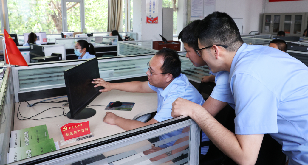 2022年6月24日,在中鐵十二局集團(tuán)勘察設(shè)計(jì)院辦公室,“黨員先鋒崗”的黨員正在與同事交流業(yè)務(wù)工作。該院充分發(fā)揮“黨員先鋒崗”的模范帶頭作用,在勘察設(shè)計(jì)業(yè)務(wù)能力提升、日常業(yè)務(wù)傳幫帶等方面積極發(fā)揮作用,助力企業(yè)高質(zhì)量發(fā)展,以實(shí)際行動(dòng)喜迎建黨101周年和黨的二十大勝利召開(kāi)。(趙桂軍 攝)