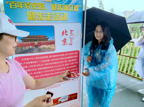 47名干部職工手持 “作示范、勇爭先”“牢記初心使命”“紅色百年,同心同行” 和公司 “服好務、管好路”的承諾等內容的小展板,快步穿行于綠樹掩映、煙雨朦朧的磨盤山中,邊走邊學。本次健步走全程4.5公里,行程中共設置了5個黨史知識競答打卡點,分別介紹中國共產黨歷史上五處標志性革命圣地:上海、井岡山、延安、西柏坡、北京,并在打卡點設置黨史知識答題卡,每人抽取一張,進行答題,引導大家重溫黨的歷史,行有所悟。