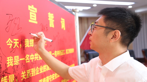 “我鄭重承諾:嚴(yán)格遵守安全法規(guī),認(rèn)真履行崗位職責(zé),自覺(jué)防范安全風(fēng)險(xiǎn),筑牢安全防線……….”。在黨總支書(shū)記郭繼明的帶領(lǐng)下,全體黨員莊嚴(yán)宣誓。