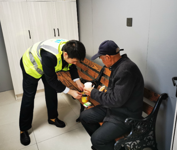情急之下,張曉宇迅速將情況報給值班員和監(jiān)控室,先為老人端來熱水勸其在便民亭內(nèi)稍作休息,安撫住老人情緒。時值寒潮降雨來襲氣溫驟降,考慮到老人出門這么久肯定沒吃東西,再加之穿著單薄,該公司武當山收費站工作人員便端來牛奶、面包和泡面,讓老人保暖充饑。