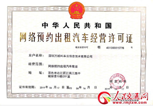 2019年6月18日,萬(wàn)順叫車百色分公司獲得百色市首批《網(wǎng)絡(luò)預(yù)約出租汽車經(jīng)營(yíng)許可證》。百色市是萬(wàn)順叫車獲得的第195張牌照。獲得牌照后,萬(wàn)順叫車立刻在百色市開展萬(wàn)順叫車的體系建設(shè),目前百色轄區(qū)內(nèi)注冊(cè)萬(wàn)順叫車司機(jī)已有2000多人,在右江區(qū)聯(lián)合服務(wù)站下設(shè)有13個(gè)站,服務(wù)站將對(duì)萬(wàn)順叫車司機(jī)進(jìn)行申請(qǐng)資格的嚴(yán)格把關(guān),并定期對(duì)司機(jī)進(jìn)行禮儀培訓(xùn)和安全生產(chǎn)培訓(xùn)。
