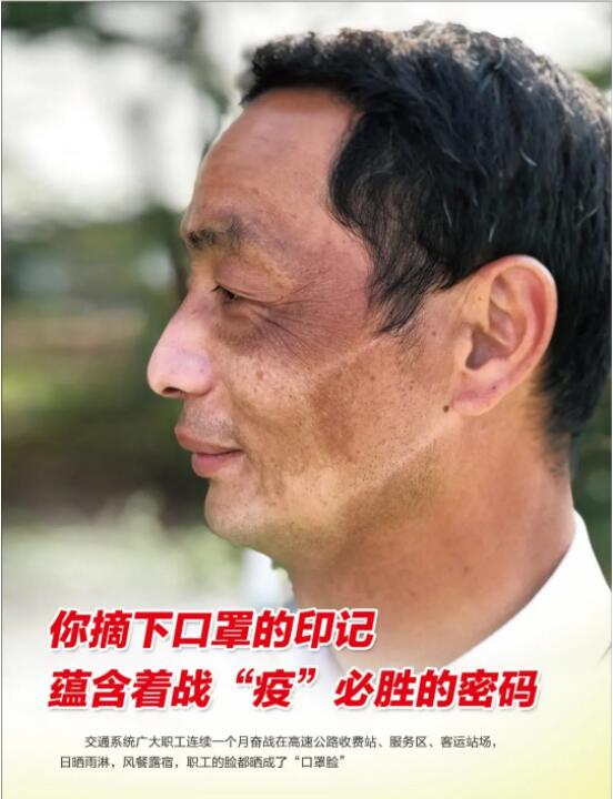 3月3日,他登上《人民日報》公益廣告,一個人就占據了一個整版。而他背后挺立的,是整個廣東交通人隊伍。在這一個月里,寒潮夾風雨,陽光帶高溫,他們臉上留下了深深淺淺的印記。“口罩臉”,是戰(zhàn)“疫”留給他們的最美印記。