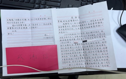 2月14日23時(shí)14分許,賈朝杰同志接到旅客林女士報(bào)警求助稱:2月5日其從廈門北站乘坐D667次列車前往潮汕站,在潮汕站下車時(shí)不慎將一部華為手機(jī)遺忘在列車上,撥打12306求助未果,只能報(bào)警求助。接報(bào)后,賈朝杰立即聯(lián)系林女士詳細(xì)了解情況,因乘車日期已逾近十天,林女士對(duì)于一些乘車細(xì)節(jié)已經(jīng)回憶不起來。民警隨后聯(lián)系了林女士座位周圍的二十多名旅客,終于得知林女士的手機(jī)當(dāng)日已被人拾撿并交至失物招領(lǐng)中心,但因未留有手機(jī)的相關(guān)信息,致使林女士一直未能尋回。最終,在乘警支隊(duì)民警的協(xié)調(diào)下,林女士經(jīng)由鐵路部門取回遺忘的手機(jī),林女士手寫近千字感謝信向賈朝杰同志致謝。