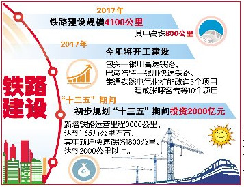 2017年,我區(qū)將全面加快建設(shè)橫跨東西、縱貫南北、快速連接、通江達海的高速鐵路網(wǎng),分享高鐵經(jīng)濟帶來的更多紅利。鐵路建設(shè)規(guī)模4100公里,其中高鐵800公里。今年春季,我區(qū)將集中開工的項目中,鐵路網(wǎng)項目7個。