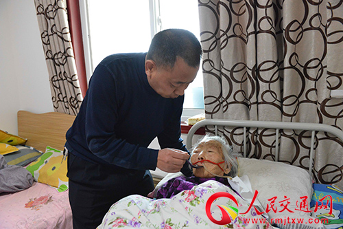 王松杰父親早逝,上有一個(gè)姐姐和一個(gè)哥哥,哥哥姐姐都家居農(nóng)村,條件相對(duì)較差。母親今年88歲, 三年前老人身體尚好時(shí),姐弟三家輪流奉養(yǎng),王松杰從來(lái)沒(méi)讓老人手里斷過(guò)零花錢。2014年后老人生活不能自理,從那時(shí)起王松杰夫妻考慮到哥哥姐姐家條件不太好,一般不讓老人到他們家去。妻子肖紅霞更是孝敬有加,在2016年10月前,除了王松杰下班在家,其他時(shí)間都由她侍候。10月6日妻子也病倒了,妻子也需要侍候,無(wú)奈王松杰讓哥哥姐姐輪流侍候了母親一段時(shí)間,不到半年的時(shí)間,妻子還在康復(fù)中,王松杰又把母親接回家中,這時(shí)母親已經(jīng)深度呆癡,四肢癱瘓,飲食不能自主吞咽。從那以后,每隔兩個(gè)小時(shí)要換一次尿墊;要打一次流食;每隔幾個(gè)小時(shí)要翻一次身;每天要按一次摩;每天要擦洗一次。俗話說(shuō)床前沒(méi)有百日孝,但是王松杰夫妻就是這樣侍候老人一年多,老太太癱瘓?jiān)诖惨荒甓,體重沒(méi)降下來(lái),身上沒(méi)生一丁點(diǎn)褥瘡。就在記者去看望她老人家時(shí),老人家雖然口不能言,但幸福的笑容總是掛在臉上。
