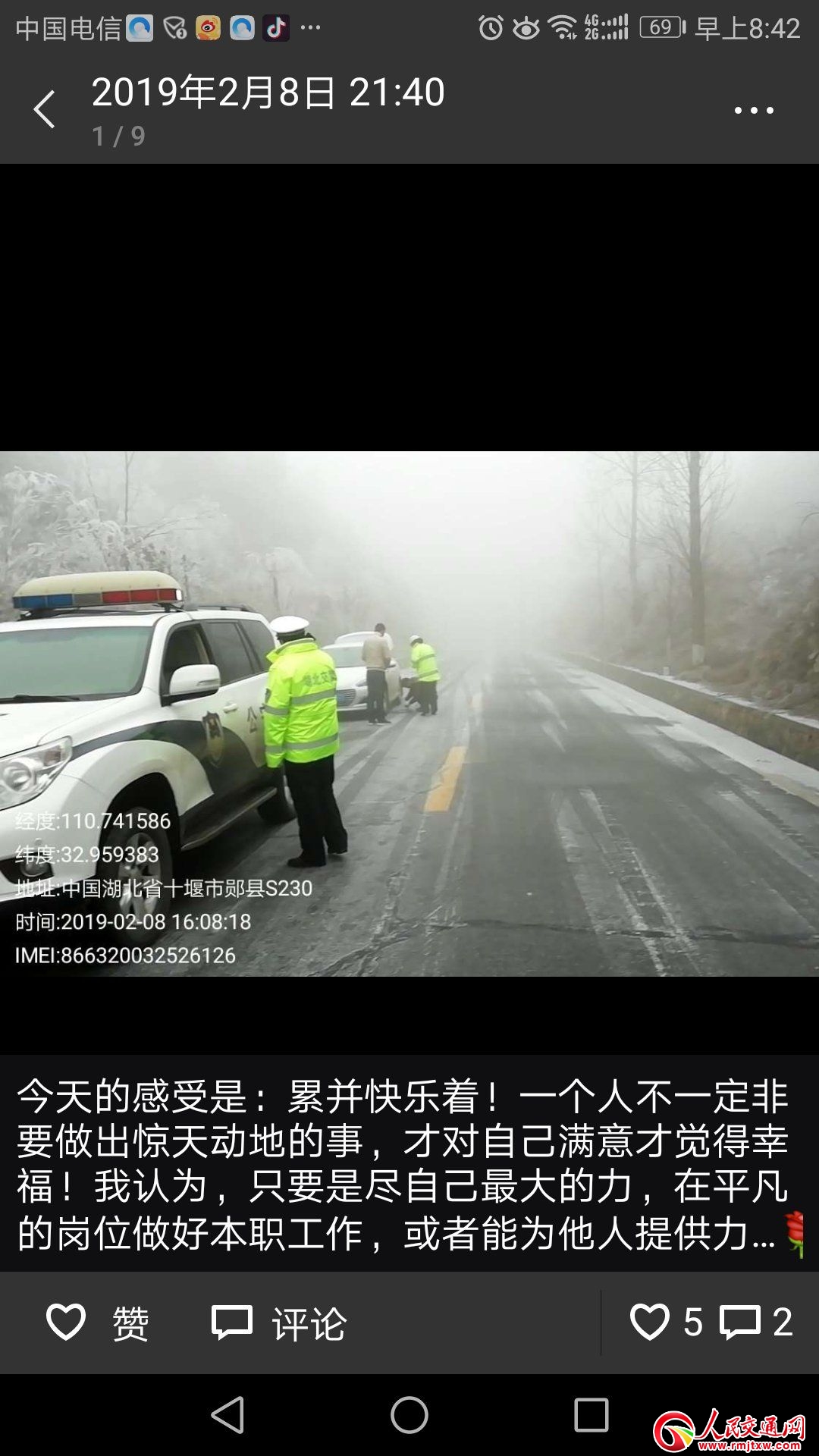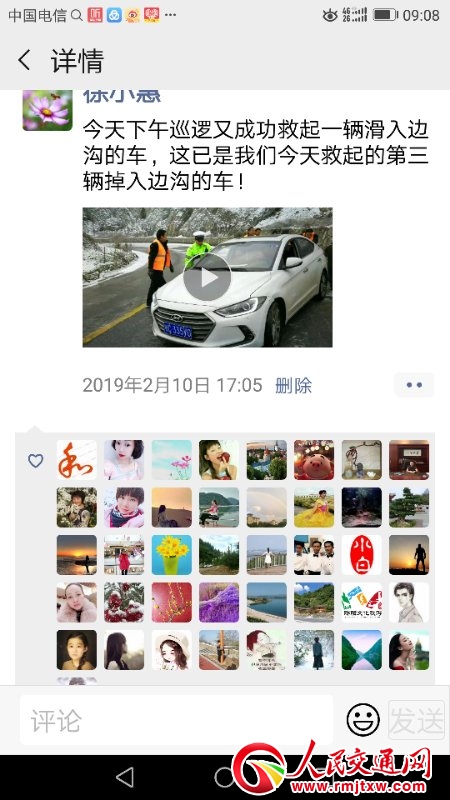 2月10日,她在朋友圈中寫(xiě)到:人多力量大!發(fā)揚(yáng)愚公精神!上午,230省道巡邏途中,遇多輛外地從高速公路下來(lái)經(jīng)230省道的外地車(chē)輛因道路結(jié)冰停到路中無(wú)法移動(dòng),還有一起從城區(qū)去大柳接病人進(jìn)城看病的皮卡車(chē)掉入邊溝,因路滑聯(lián)系施救車(chē)輛不敢上來(lái),還有急拐彎處兩車(chē)輕微事故……
