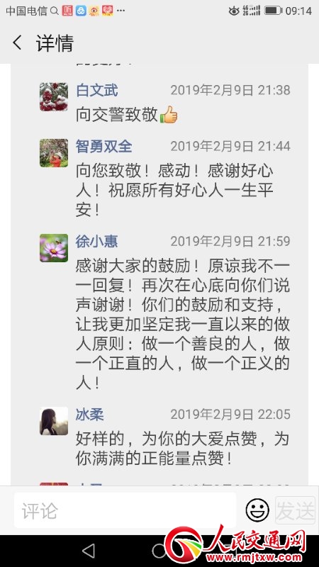 “其實(shí)也無(wú)所謂的,作為一名交警,暢通不僅是一種承諾,更是一種責(zé)任,能為了群眾的平安出行,并得到大家的認(rèn)同,再苦再累也值了!”2月12日,當(dāng)筆者見(jiàn)到徐小惠,提及她的故事、事跡燃炸朋友圈微信之事,她婉兒一笑,顯得很坦然地說(shuō)。
