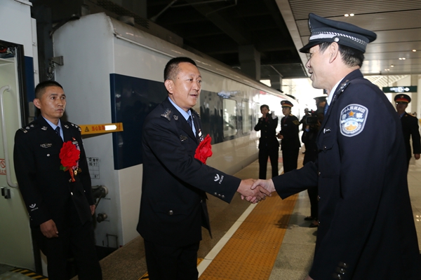 王寶生主任、朱光輝政委走上前去分別王偉和崔彥明一一握手,向他們表示熱烈祝賀,并致以誠摯慰問。民警代表也為兩位同志獻上了鮮花。站臺上,王偉支隊長向局處領(lǐng)導(dǎo)和民警們簡要介紹了出席全國公安系統(tǒng)英雄模范立功集體表彰大會的盛況。參加歡迎的全體民警無不深受鼓舞,為之驕傲、為之振奮。大家紛紛表示,一定要認真學(xué)習(xí)西寧乘警支隊和崔彥明同志的先進事跡,進一步做好各項公安保衛(wèi)工作,以實際行動為十九大勝利召開營造良好的治安環(huán)境。(石進雄 謝飛)