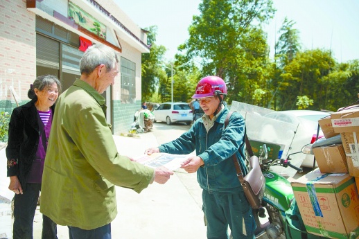 5月9日,岳陽縣月田鎮(zhèn)花苗村,月田郵政支局投遞員徐永輝將報(bào)紙送到村民手上。傅聰 攝