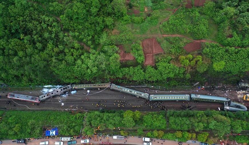 3月30日,兩名消防員在火車脫軌現(xiàn)場作業(yè)(無人機照片)。當(dāng)日11點40分許,T179次列車途經(jīng)京廣鐵路湖南省郴州市永興縣高亭司鎮(zhèn)永華村路段時,因附近山體滑坡,撞上塌方體,中斷行車。據(jù)郴州市相關(guān)部門消息,截至目前,事故已造成1人死亡,4人重傷,123人輕傷。傷員正送往附近醫(yī)院緊急救治。