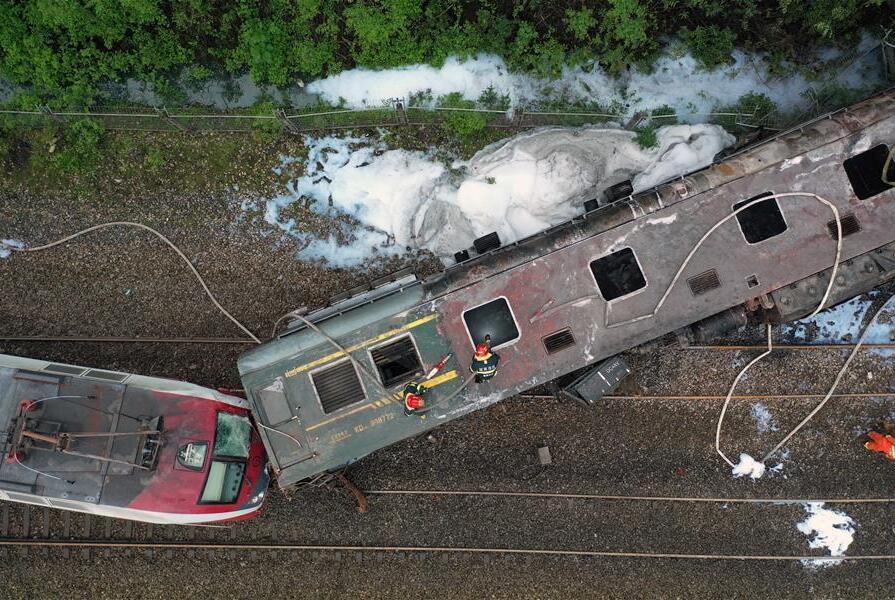 3月30日,兩名消防員在火車脫軌現(xiàn)場作業(yè)