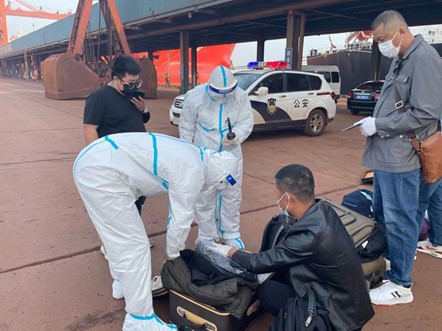 據(jù)了解,“中華”輪上17名中國籍船員已連續(xù)在船工作11個月,高強度的工作壓力對船員健康狀態(tài)和心理思想產(chǎn)生了影響。為保障船舶安全及船員生命健康,船方申請在5月19日?坎苠楦垲^并更換船員。在接船方申請后,曹妃甸出入境邊防檢查站第一時間啟動疫情防控預(yù)案,提前與船舶代理、聯(lián)檢單位進行溝通協(xié)調(diào),確保各項環(huán)節(jié)有序開展。下午16時30分,曹妃甸邊檢站將查驗窗口前移至碼頭一線,迅速為17名中國籍船員辦理了邊檢手續(xù),節(jié)約了更多的入境時間。