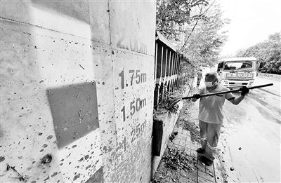 昨天一早,在旱河路鐵路橋,該下凹式橋梁位于地鐵6號線田村路站以北,京糧廣場的西北側。橋區(qū)共有四個橋洞,供機動車行駛的主路為雙向六車道,中間用綠化帶隔開。這座鐵路橋地勢很低,坡度也比較陡,基本上是周邊地區(qū)的最低點,橋體的欄桿上可以看到限高3.5米的標識,但沒有看到明顯的涉水警示牌。早上9時,橋區(qū)內積水已經排空,路面滿是淤泥。海淀環(huán)衛(wèi)部門從凌晨5時起,派出6名環(huán)衛(wèi)工人用鐵鍬鏟泥,2輛灑水車對頭在主路上行駛,反復沖洗地面。據悉,在橋區(qū)主路下凹處畫有水位線,從橋柱上殘留的水痕和泥印可以看出,積水最深處將近2米。