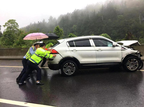 先行趕到現(xiàn)場的巡檢辦工作人員,一邊快速擺放警示錐桶形成事故車輛后方防護(hù),迎著雨水手持指揮棒維護(hù)現(xiàn)場交通秩序;一邊上前確認(rèn)事故無人員受傷,并轉(zhuǎn)移車載人員至護(hù)欄外的安全區(qū)域。隨后,巡檢辦工作人員協(xié)同高警、路政人員的到來,冒雨將事故車輛推離至應(yīng)急車道,以防二次事故發(fā)生。