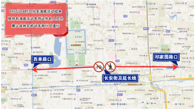 9月7日18時30分至活動結(jié)束,長安街及延長線由西單路口(不含)至祁家園路口(不含)雙方向路段,除持有演練活動專用證件的人員外,禁止其他非機(jī)動車和行人通行。