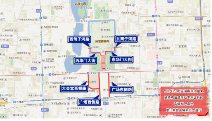 9月7日18時至演練活動結(jié)束,天安門前金水橋以北,故宮午門以南地區(qū),西華門路口(不含)經(jīng)西華門大街、西筒子河路、東筒子河路、東華門大街至東華門路口(不含),天安門廣場東、西側(cè)路,人民大會堂西、南側(cè)路,上述區(qū)域除持有演練活動專用證件的車輛和人員外,禁止其他車輛和行人通行。