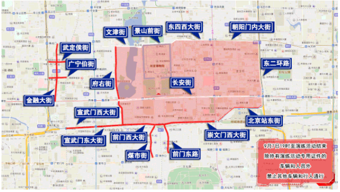 9月7日19時至演練活動結(jié)束,文津街、景山前街、五四大街、東四西大街、朝陽門內(nèi)大街一線以南(不含上述道路),東二環(huán)路由朝陽門橋至北京站東街東口一線以西(不含上述道路),北京站東、西街(不含西向東半幅路)、崇文門西大街(不含崇文門路口)、前門東大街、前門西大街一線以北,北新華街、府右街一線以東以內(nèi)區(qū)域,以上區(qū)域不含長安街主路。前門東路;煤市街;宣武門東、西大街(不含宣武門路口);金融大街;武定侯街;廣寧伯街,上述區(qū)域和道路除持有演練活動專用證件的車輛和人員外,禁止其他車輛和行人通行。
