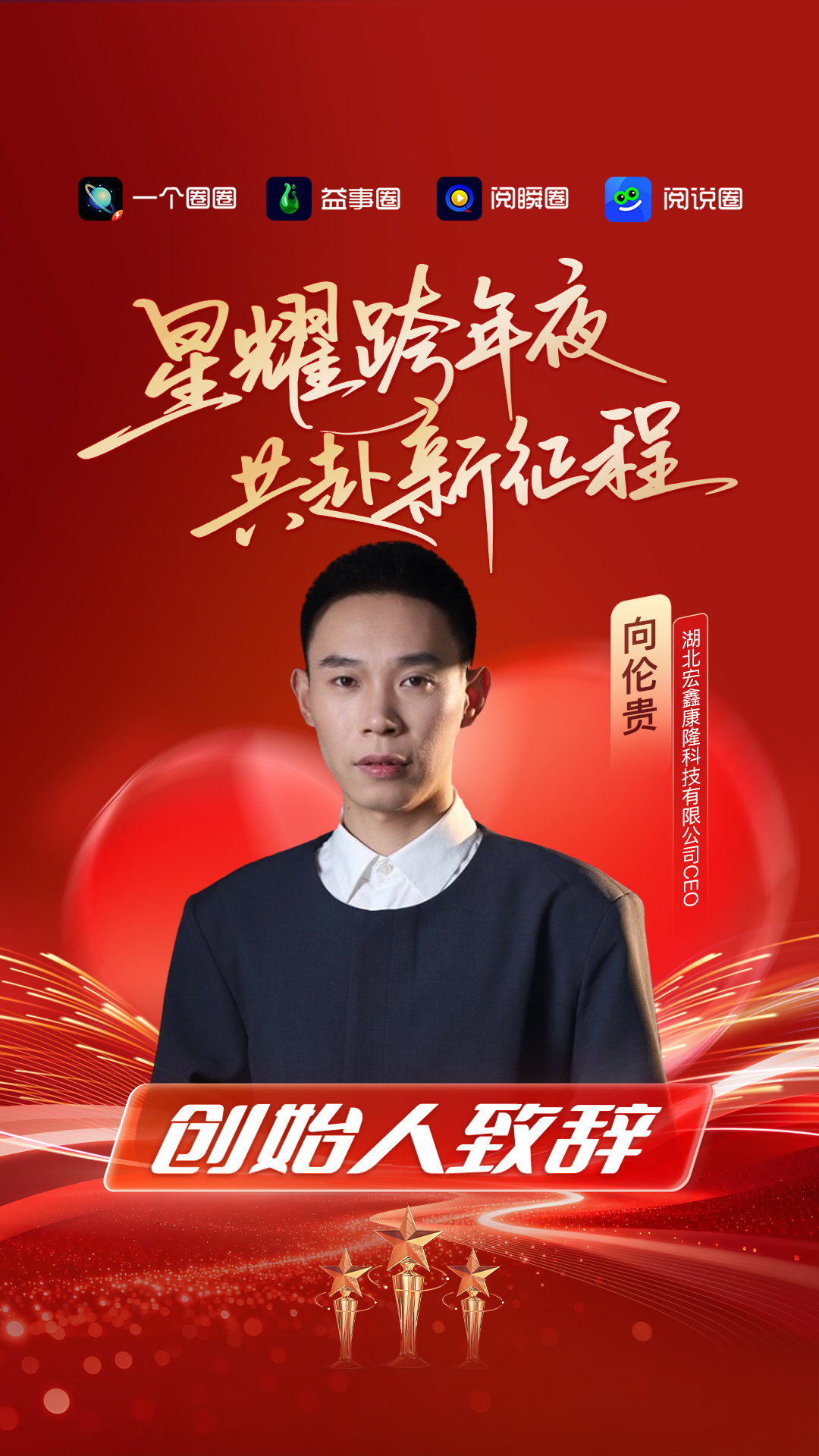 隨后,湖北宏鑫康隆科技有限公司聯(lián)合創(chuàng)始人兼運(yùn)營副總向倫貴登臨主會(huì)場直播間致辭。他以“星光為幕,夢想為燈”,向每一位在生態(tài)中堅(jiān)守初心、創(chuàng)造價(jià)值的“圈圈家人”致以問候,并代表公司全體同仁,向精心籌備盛會(huì)的市場發(fā)展委員會(huì)成員、登臺(tái)獻(xiàn)藝的表演者致以誠摯謝意。
