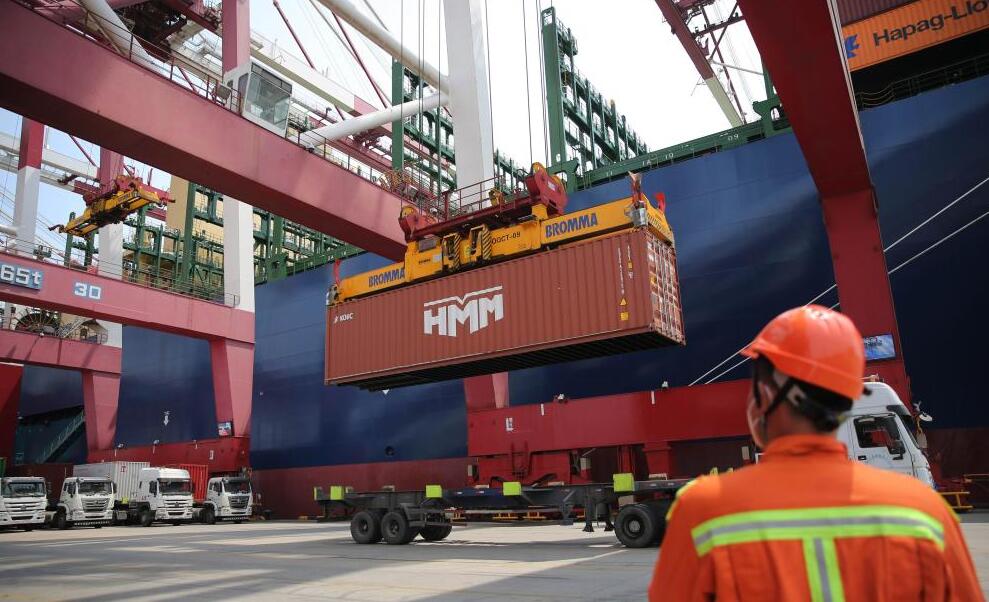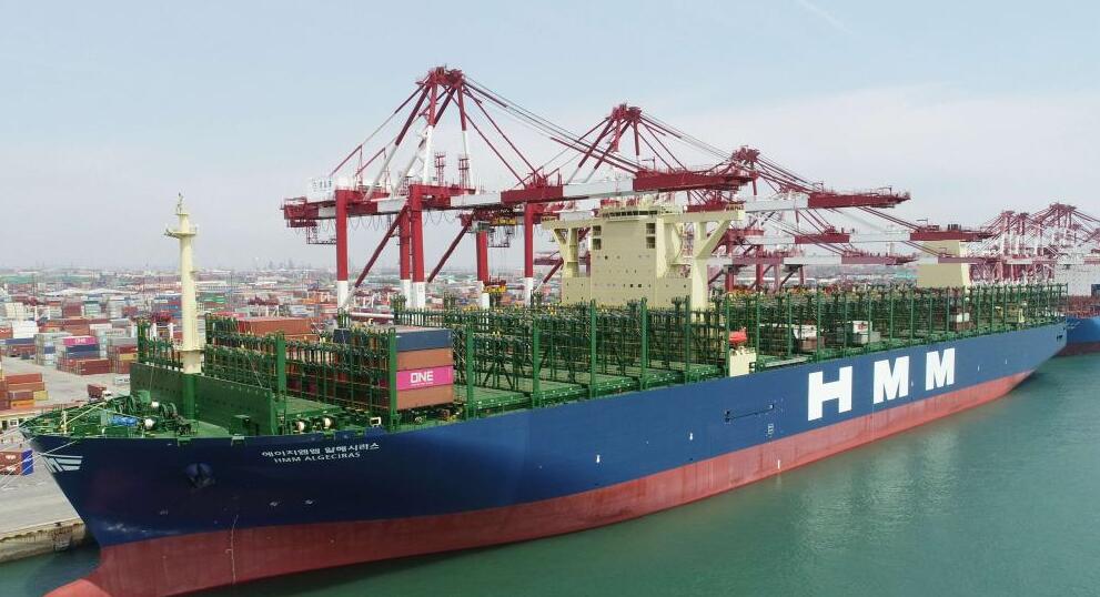 4月26日,載箱量2.4萬(wàn)標(biāo)準(zhǔn)箱的全球最大集裝箱班輪—— “HMM阿爾赫西拉斯”輪首航山東港口青島港。 該輪23日剛在韓國(guó)交付,船長(zhǎng)399.9米,寬61.03米,型深33.2米,是目前投入運(yùn)營(yíng)的全球最大的集裝箱船舶。