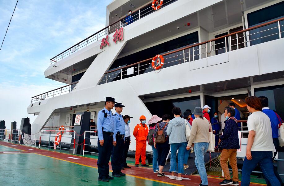 上午10時30分,載有200位來崇游客的浦江游覽觀光船“雙擁”號駛?cè)腴L江崇明段新河水域。此時此刻,在新河水域執(zhí)行花博會安保任務(wù)的長江航運公安局上海分局公安巡邏艇正密切關(guān)注著“雙擁”號的航行路線,確保游船安全靠岸。上午11時整,“雙擁”號緩緩靠入新河碼頭,船上的乘客拎著大包小包紛紛下船,一時間,碼頭上人流涌動。早已在碼頭上守候的崇明派出所民警第一時間響應(yīng)群眾需求、疏通碼頭通道,優(yōu)先確?瓦\大巴車準(zhǔn)時到達(dá)水陸聯(lián)運接駁點,在15分鐘內(nèi)成功有效疏散旅客。