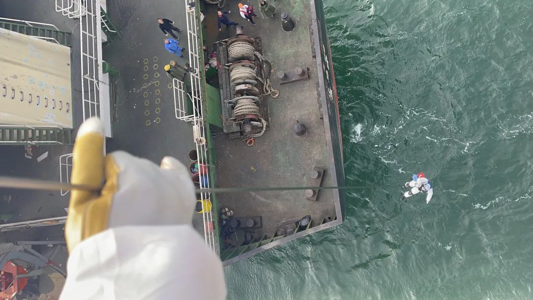 8分鐘,機(jī)組人員現(xiàn)場(chǎng)吊運(yùn)作業(yè),成功救助1名傷員,并將1名陪同轉(zhuǎn)運(yùn)至救助直升機(jī)。