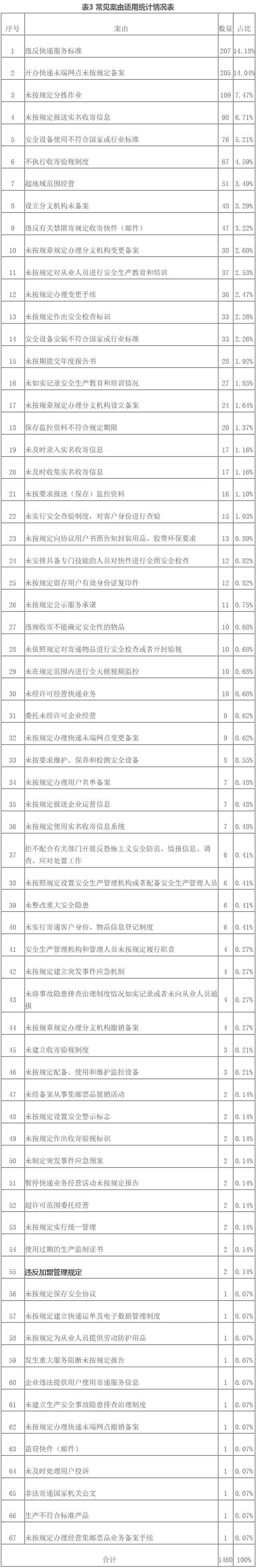 從郵政管理部門查處的違法行為情形以及適用的具體案由看,在2020年上半年行政執(zhí)法案件中,數(shù)量占比居前十位的違法行為分別是:違反快遞服務(wù)標(biāo)準(zhǔn)207件,占比14.18%;開辦快遞末端網(wǎng)點(diǎn)未按規(guī)定備案205件,占比14.04%;未按規(guī)定分揀作業(yè)109件,占比7.47%;未按規(guī)定報(bào)送實(shí)名收寄信息98件,占比6.71%;安全設(shè)備使用不符合國家或行業(yè)標(biāo)準(zhǔn)76件,占比5.21%;不執(zhí)行收寄驗(yàn)視制度67件,占比4.59%;超地域范圍經(jīng)營51件,占比3.49%;設(shè)立分支機(jī)構(gòu)未備案48件,占比3.29%;違反有關(guān)禁限寄規(guī)定收寄快件(郵件)47件,占比3.22%;未按規(guī)章規(guī)定辦理分支機(jī)構(gòu)變更備案38件,占比2.60%。
