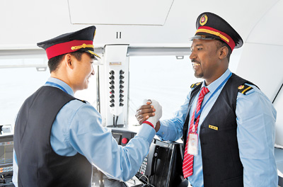 埃塞俄比亞拉布車站,中埃雙方司機在握手預祝通車成功。新華社記者 李百順攝