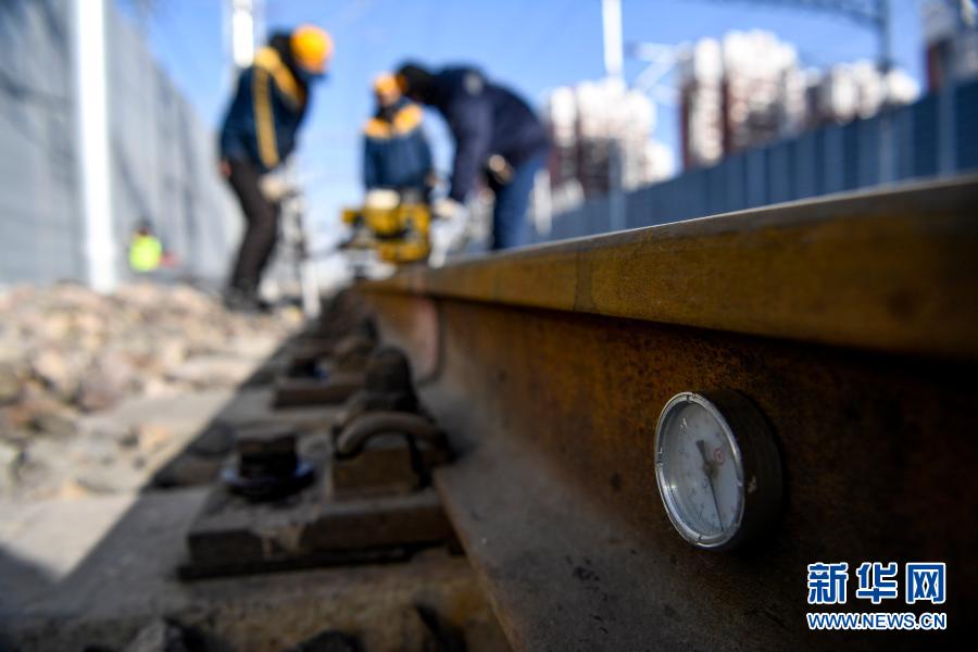 中鐵蘭州局銀川工務(wù)段職工進行搗固作業(yè),軌溫計顯示鐵軌溫度為零下10攝氏度