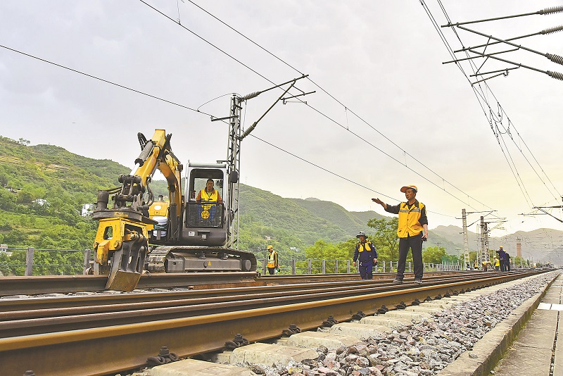 近日,安康工務(wù)段職工在襄渝下行線指揮挖掘機(jī)作業(yè)。楊精銓/攝