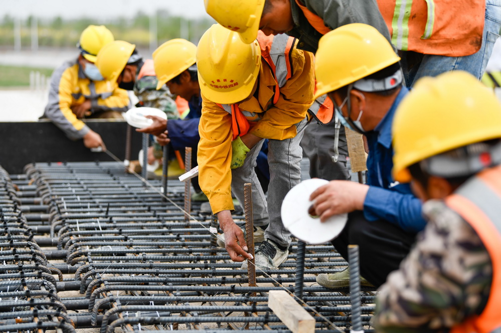 5月23日,中鐵四局工人在河北省唐山市境內(nèi)京唐鐵路七標(biāo)段施工現(xiàn)場(chǎng)綁扎鋼筋。
