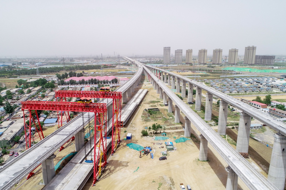 位于河北省唐山市境內(nèi)的京唐鐵路七標(biāo)段施工現(xiàn)場(chǎng)(5月23日攝,無(wú)人機(jī)照片)。