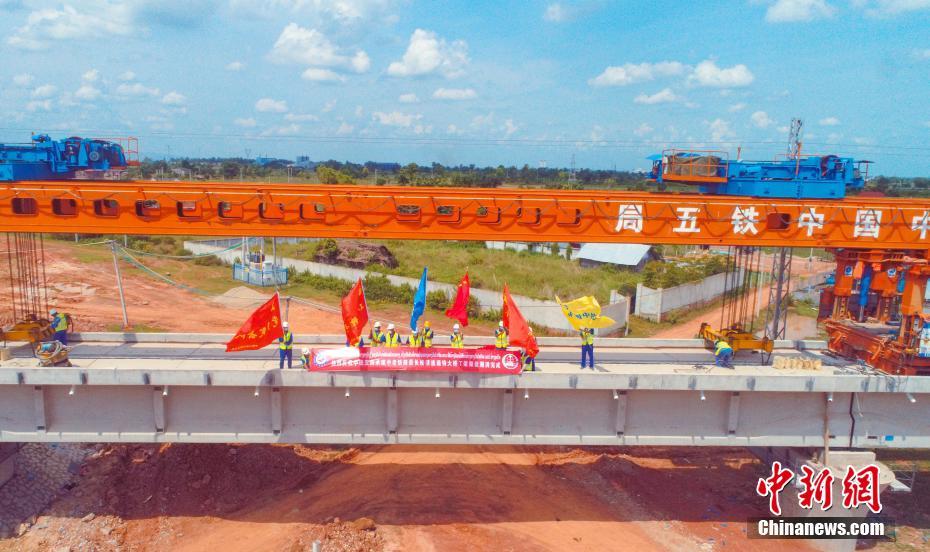 7月5日,隨著架梁作業(yè)人員操作著JQT-180型架橋機將逢通特大橋最后一片T梁落在橋臺上,由中鐵五局六公司承建的中老鐵路最長橋梁——逢通特大橋架設完成,這標志著“一帶一路”標志性工程中老鐵路正線架梁貫通。逢通特大橋位于老撾首都萬象市,橋長7528.56米,共計227跨橋梁,橋梁運輸、架設安全管理難度大,是本標段的控制工程。 中新社發(fā) 謝永彬 攝