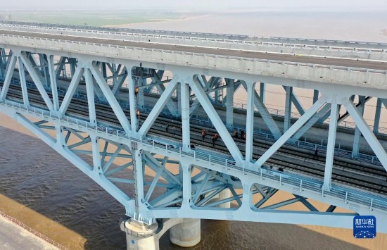 11月15日,中國鐵路鄭州局集團(tuán)有限公司的工作人員在鄭濟(jì)高鐵黃河特大橋上進(jìn)行全面檢查(無人機(jī)照片)。