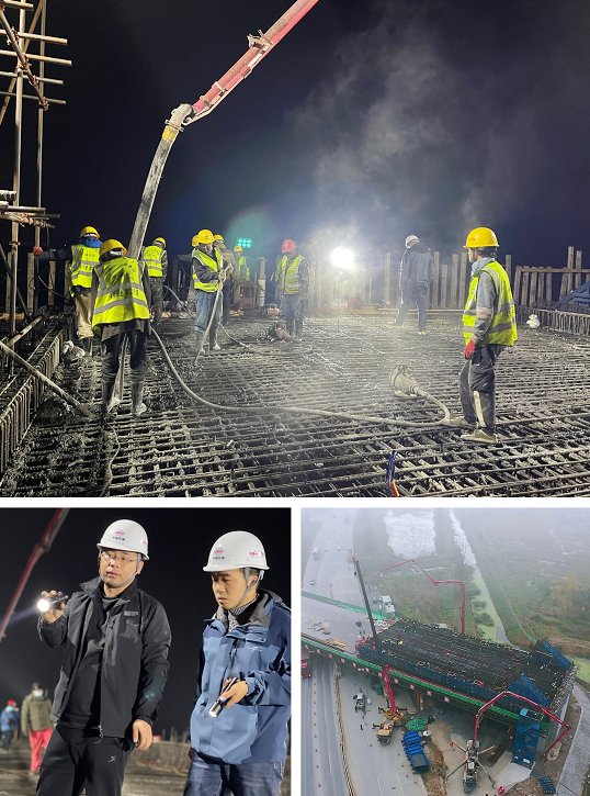 該段系桿拱跨318國(guó)道,道路交通復(fù)雜,來(lái)往車流量大,安全風(fēng)險(xiǎn)高,針對(duì)跨國(guó)道部分施工,項(xiàng)目部提前與當(dāng)?shù)亟还懿块T進(jìn)行溝通協(xié)商,編寫交通導(dǎo)改方案,做好安全防護(hù)措施,確保系桿拱橋首段澆筑順利完成。該次系桿拱A節(jié)段砼方量為1210立方米,技術(shù)要求高、施工難度大、風(fēng)險(xiǎn)因素多,處于架梁通道的“咽喉”部位,為保證施工安全和系桿拱梁體質(zhì)量,梁體采用兩臺(tái)泵車連續(xù)不間斷澆筑作業(yè)。上跨318國(guó)道墩上特大橋128m系桿拱A節(jié)段梁體的順利澆筑,不僅為池黃高鐵跨318國(guó)道主線工程施工提供了經(jīng)驗(yàn)參考,也為后續(xù)施工工序的穩(wěn)步推進(jìn)奠定了堅(jiān)實(shí)的基礎(chǔ)。