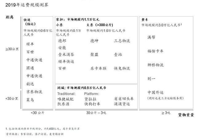 放眼全球,不僅國內(nèi)的公路貨運(yùn)市場已是全球第一,而且公路貨運(yùn)作為最基礎(chǔ)且最先被互聯(lián)網(wǎng)改造成為網(wǎng)絡(luò)貨運(yùn)的板塊,其降本增效的意義不凡。去年,麥肯錫發(fā)布數(shù)據(jù)報告顯示,中國公路貨運(yùn)市場中,整車運(yùn)輸占據(jù)50%以上的市場規(guī)模,約3萬億元;其次為零擔(dān)和同城運(yùn)輸,均為約1萬億元;剩余市場包括快遞的陸運(yùn)部分,約為0.6萬億元。